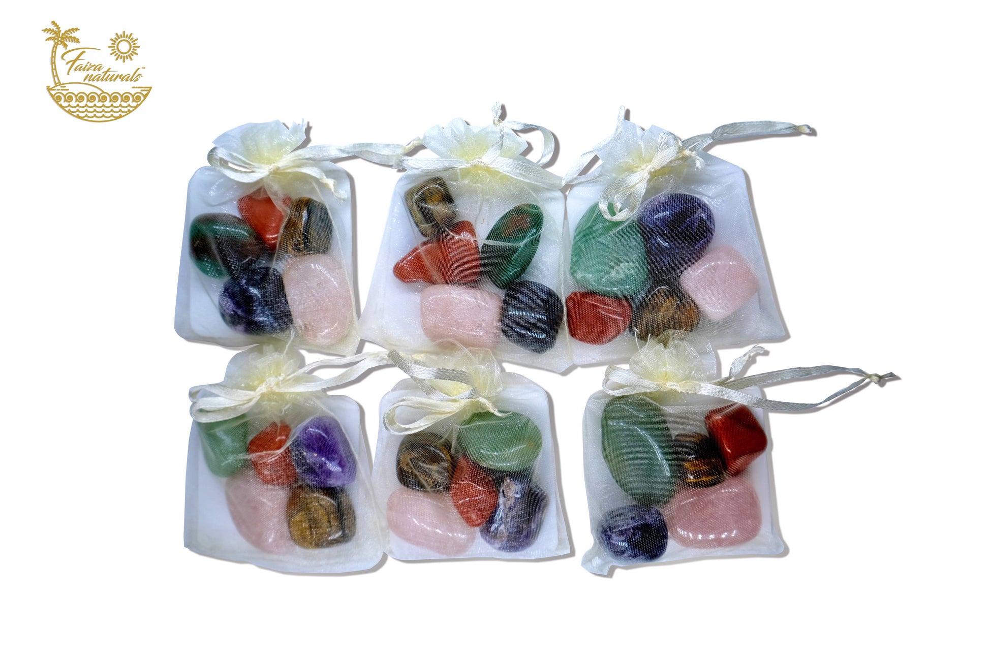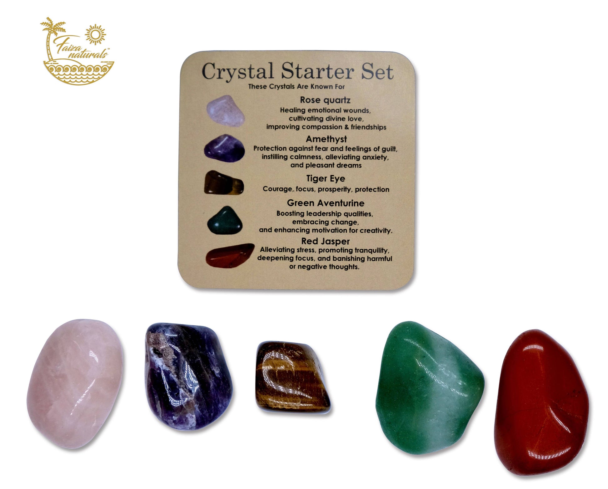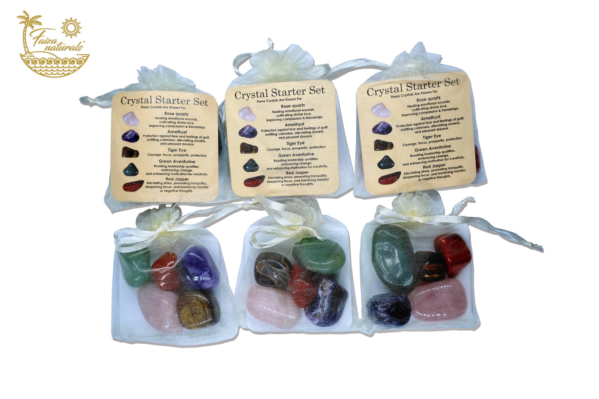 Faiza Naturals is proud to present our Crystals Starter Set meticulously sourced and curated selection of all natural and ethically-mined polished crystals! Each set includes the gorgeous 5 piece hand selected tumbled crystals with an introduction card explaining the powers and intentions of each crystal. They precariously packaged in a breathtaking yet abrasive-free mesh gift pouch.