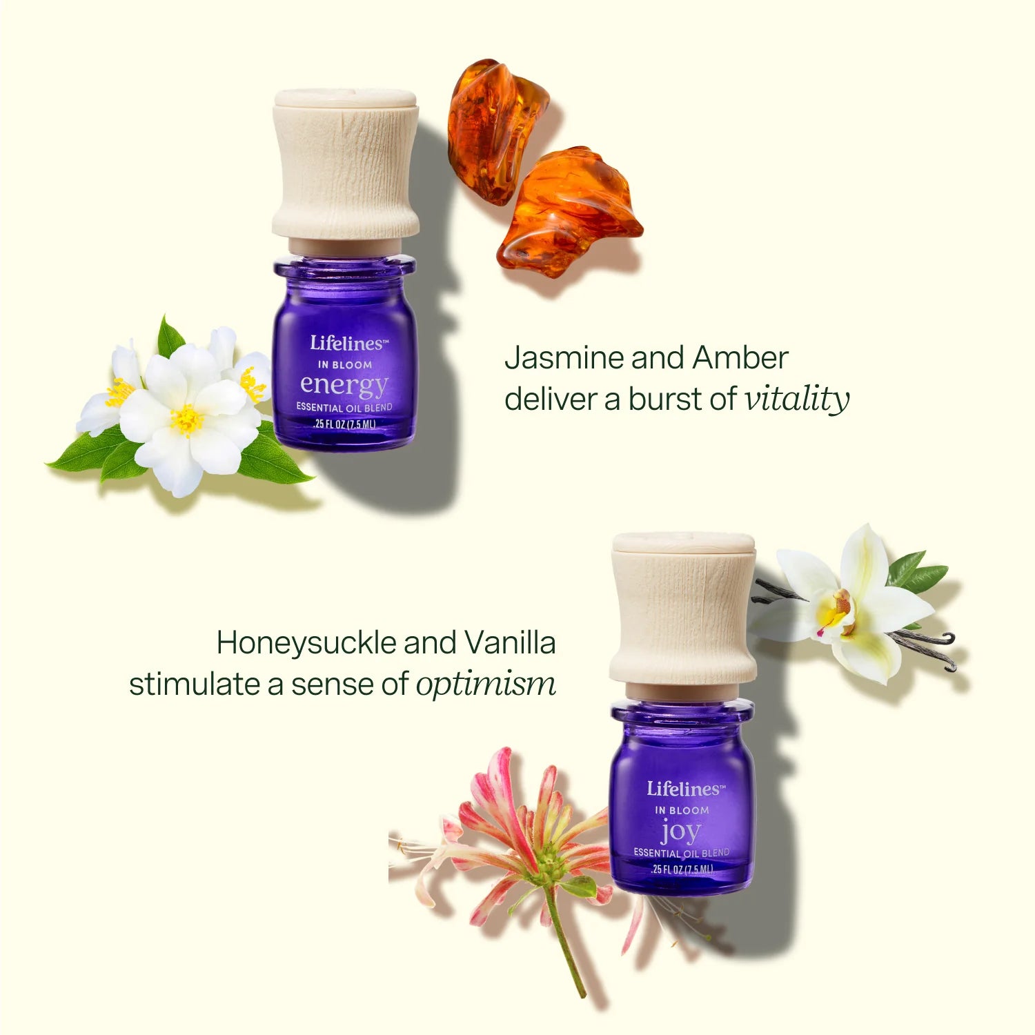 Lifelines blends contain 100% pure essential oils & natural botanicals. Patent pending Precision Pump for easy dispensing. In Bloom collection evoke spring meadows and flowers blossoming in the sunshine. Energy, Calm, Focus, Joy; these will become a vital tool in your daily well-being practice.