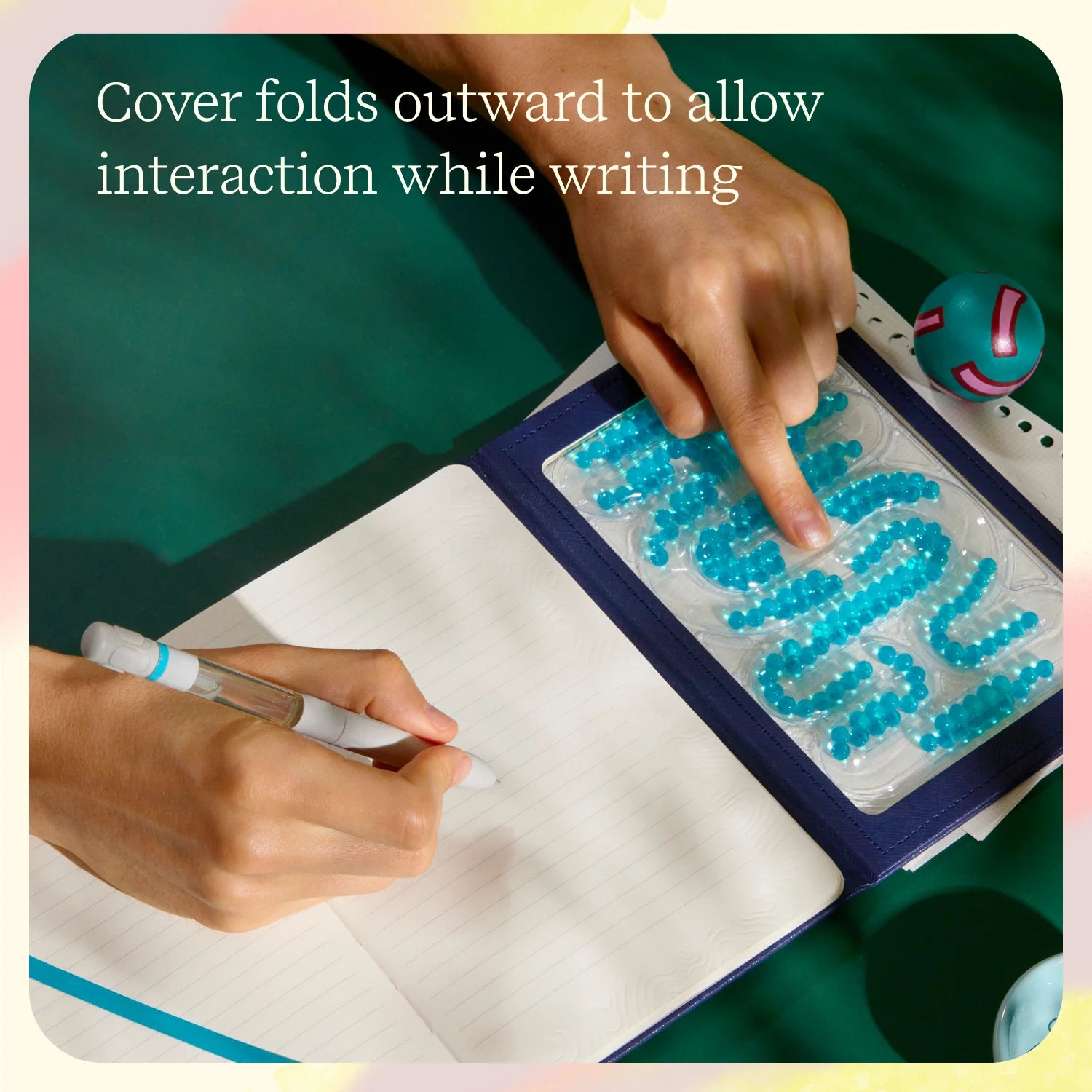 Designed inside and out to focus your attention and quiet your mind. A meditative writing experience with stimulating gel bead cover and embossed tactile paper. 160 embossed tactile page sensory cover journal, elastic band, pen holder, ribbon marker.