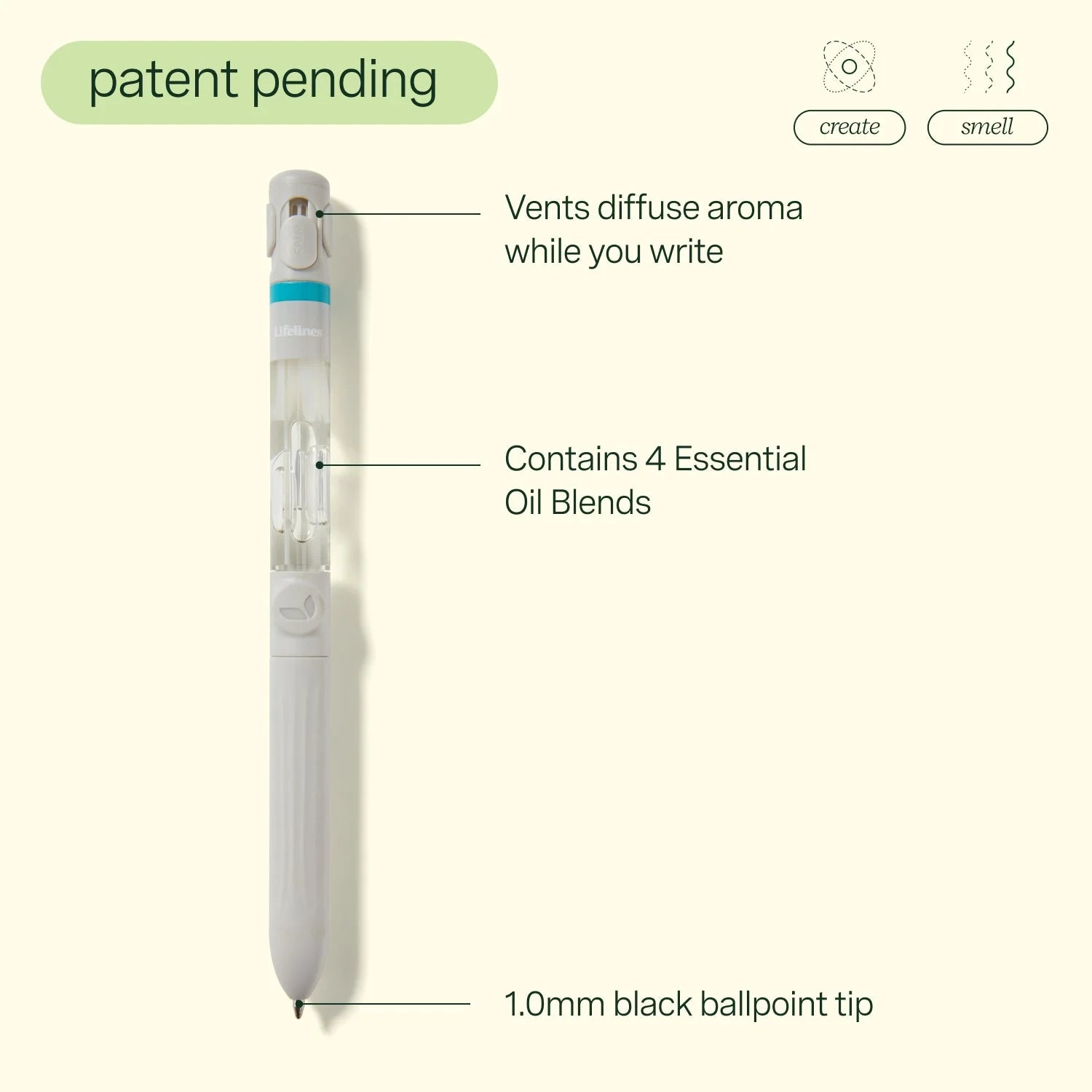 The Lifelines Pen Diffuser transforms your writing into a beautiful sensory experience by diffusing aroma as you go. Pen contains 4 Essential Oil Blends. 4 states of well-being: Joy, Calm, Energy, Focus.