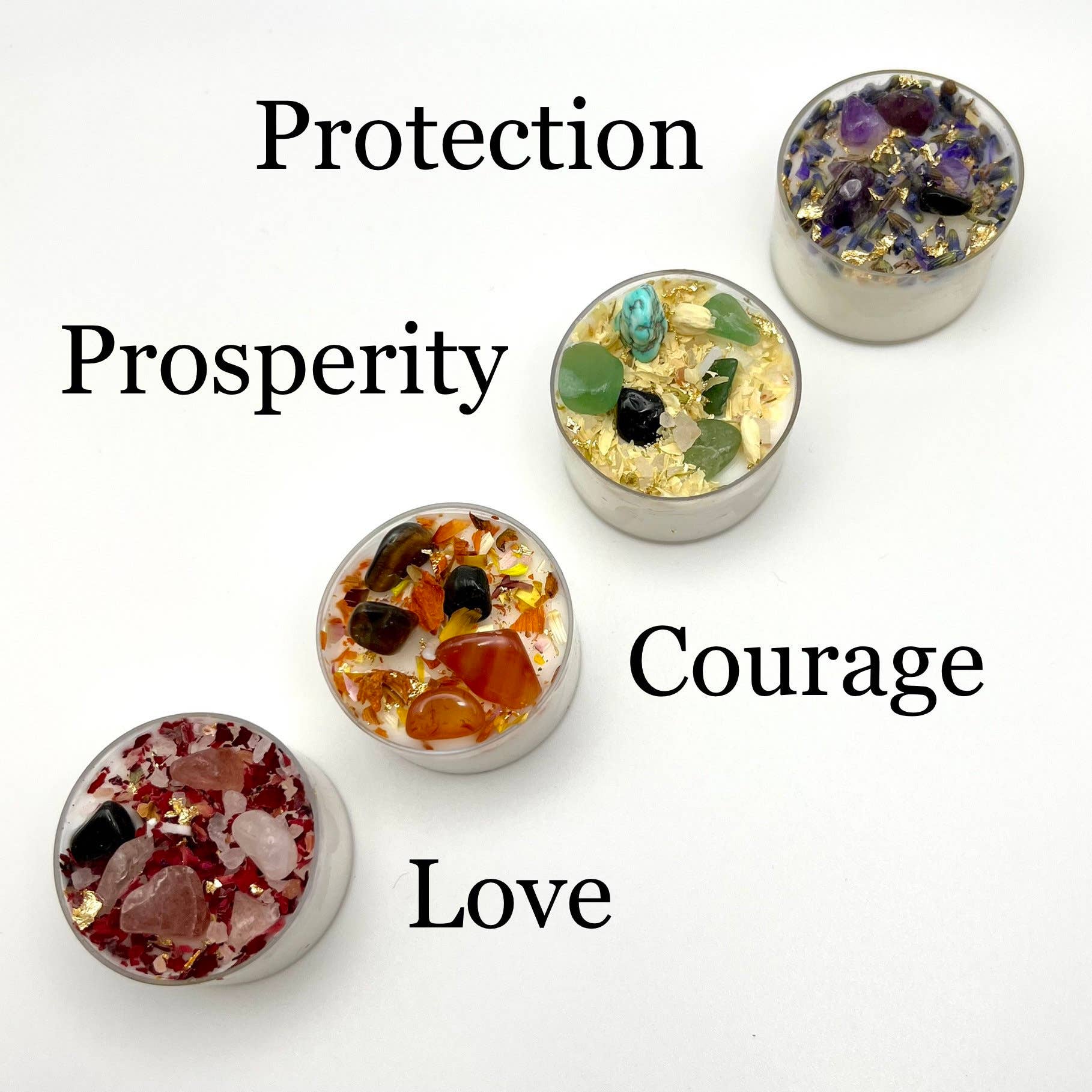🌟 Set of 4 Intentions 🌟 Courage: Orange Lily, Tiger's Eye and Carnelian help you be bold, persistent and steady. Protection: Lavender and Amethyst protect the user's mind and spirit from negative forces. Prosperity: Inspires success, good luck and increased attraction with Jasmine and Aventurine. Love: Opens the heart to feelings of love with rose petals and Strawberry Quartz.